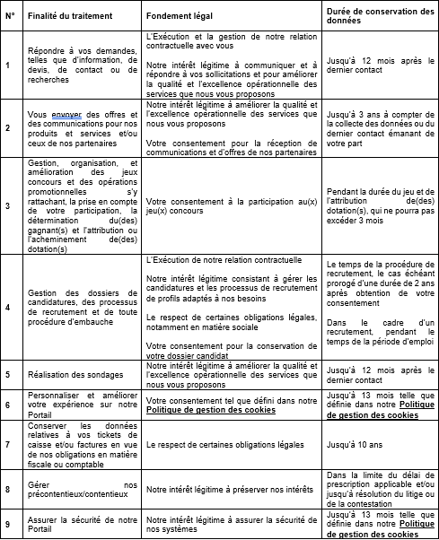Nous conserverons vos Données à caractère personnel pendant une durée qui n’excède pas la durée nécessaire aux finalités pour lesquelles elles sont collectées et traitées, durée qui est prolongée, le cas échéant, des durées de prescriptions légales ou réglementaires applicables (cf. tableaux ci-dessus).